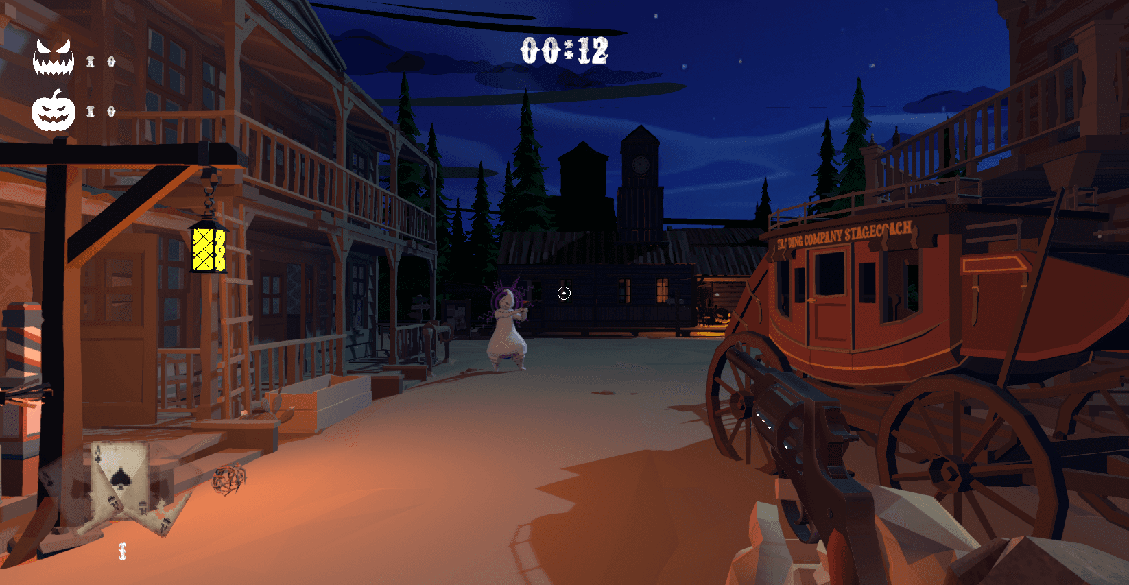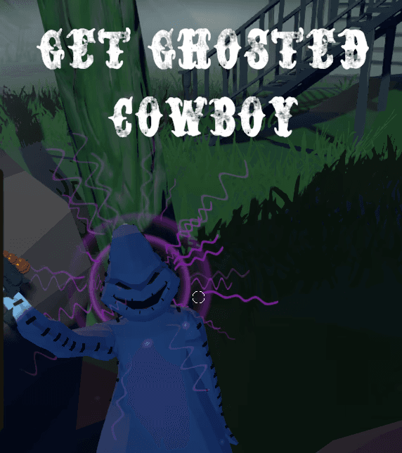 The result is a Western-themed first-person shooter, in which the player must shoot at a ghost that randomly appears every five seconds across a semi-open map while collecting pumpkins scattered throughout the environment. The ghost’s position can be identified using a crosshair system inspired by the “Haedir” mechanic from Middle Earth: Shadow of War.